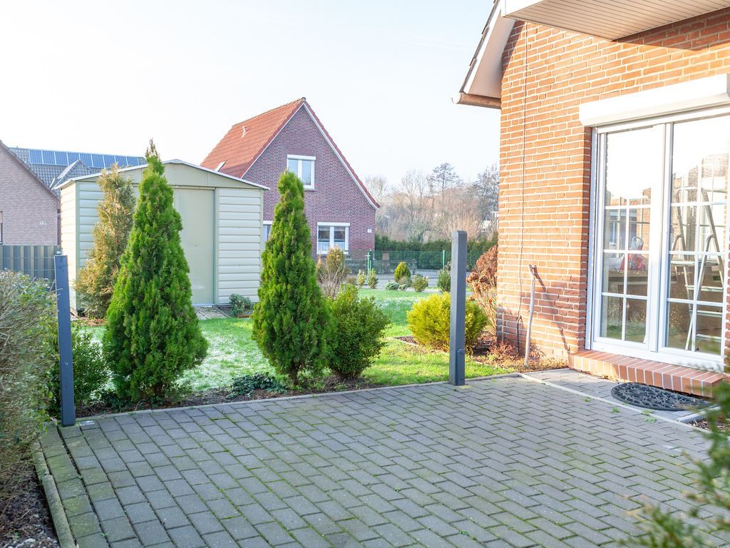 - Rasenfläche, Rabatten, gepflasterte Terrasse